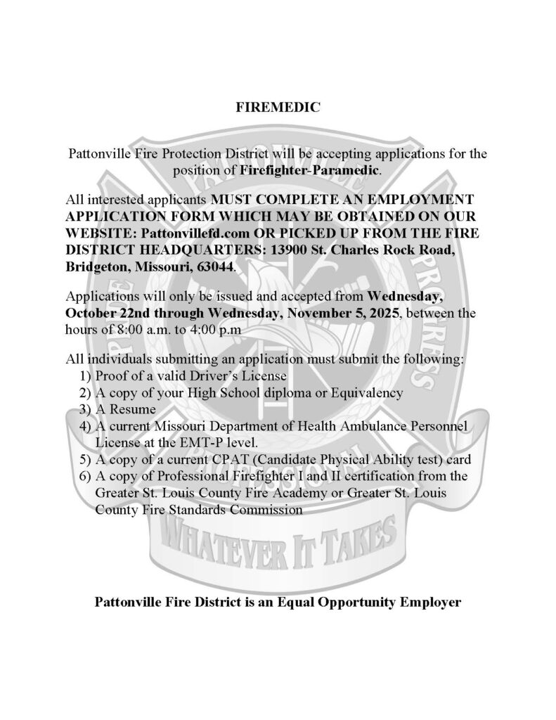 Share this post Share on FacebookShare on Facebook Share on XShare on X Pin itShare on Pinterest Share on LinkedInShare on LinkedIn Author: Betty Stoecklin Post navigationPreviousPrevious post:City of Crestwood hiring noticeRelated postsCity of Crestwood hiring noticeOctober 7, 2025Metro West hiring notice – through 10-24-2025September 30, 2025Eureka – Asst. Chief-Training Officer hiring notice through 9-29-2025September 23, 2025Frontenac through 9-26-2025September 16, 2025Maryland Heights hiring through 10-31-2025September 8, 2025Richmond Heights hiring through 9-4-2025August 19, 2025
